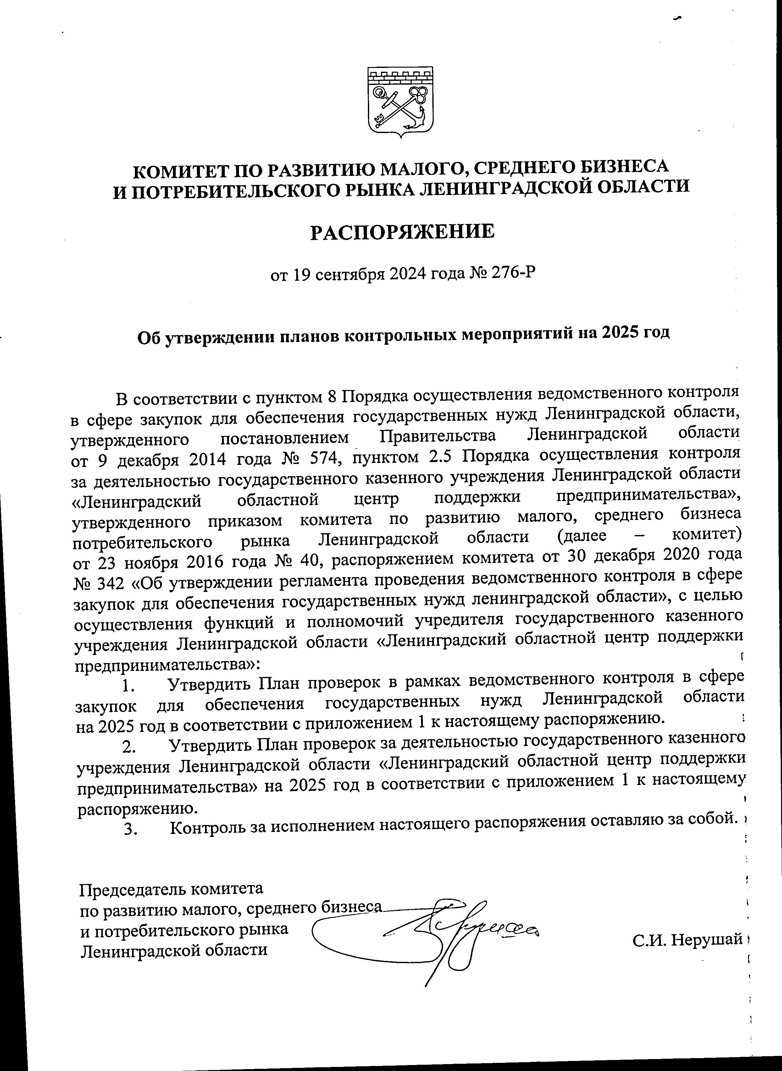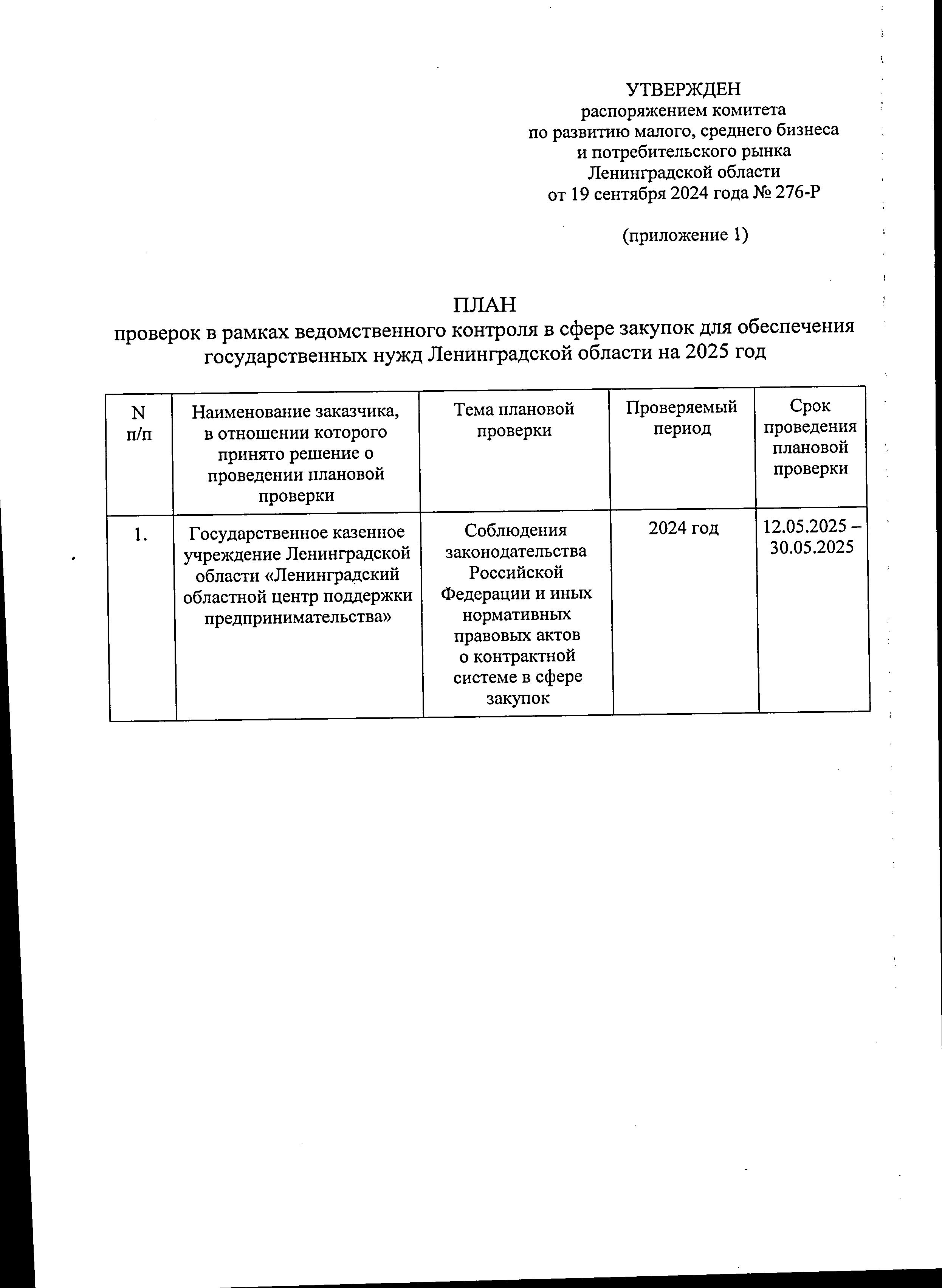 ПЛАН ведомственного контроля в сфере закупок для обеспечения государственных нужд Ленинградской области в отношении подведомственного заказчика на 2025 Распоряжение о проведении проверок в сфере закупок для обеспечения государственных нужд Ленинградской области в отношении подведомственного заказчика на 2025